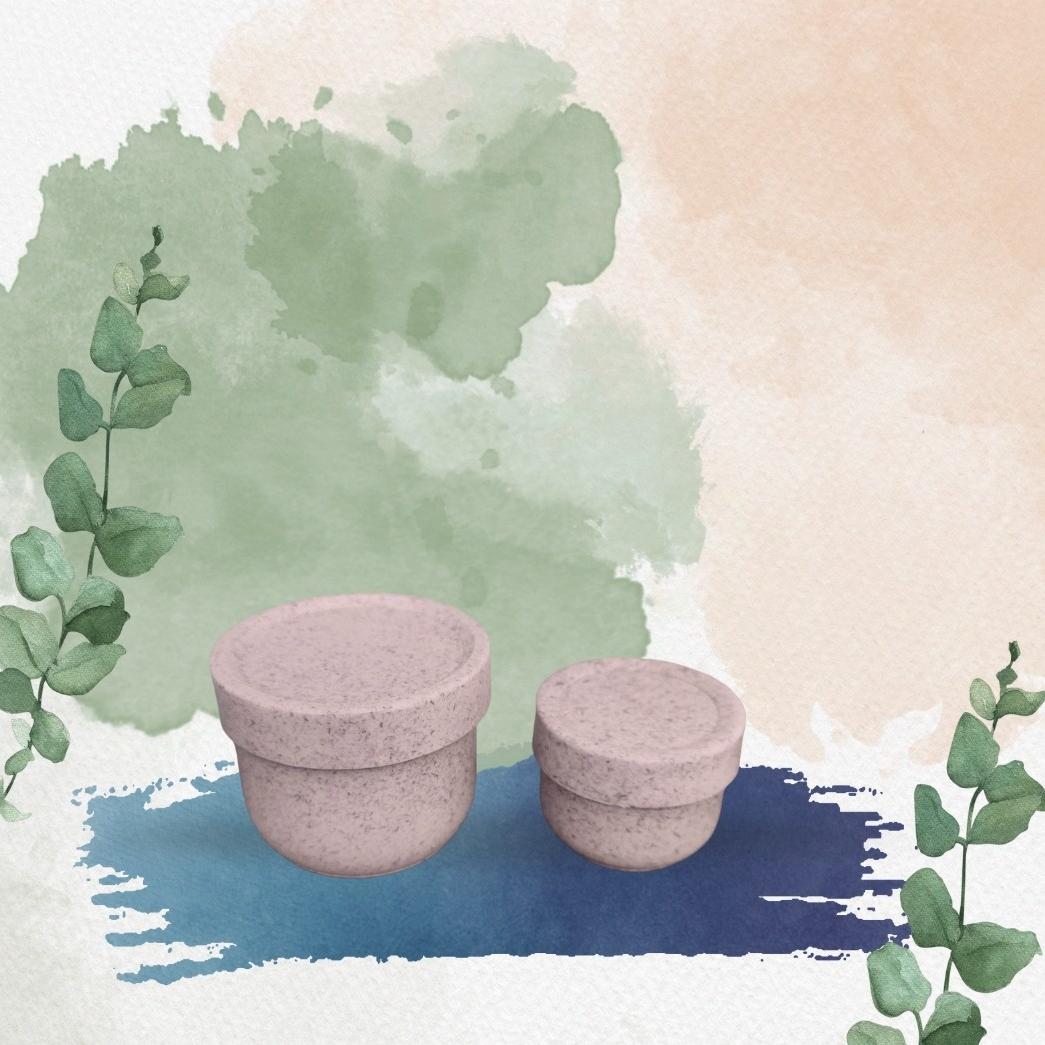 Trajnostna embalaža za vašo naravno kozmetiko. Lonček je izdelan iz materiala z dodatkom rastlinskih vlaken (20% riževih luščin), kar mu daje topel, naraven videz in prijeten občutek na otip. Namenjen je večkratni uporabi in ne vsebuje škodljivih snovi (BPA free).