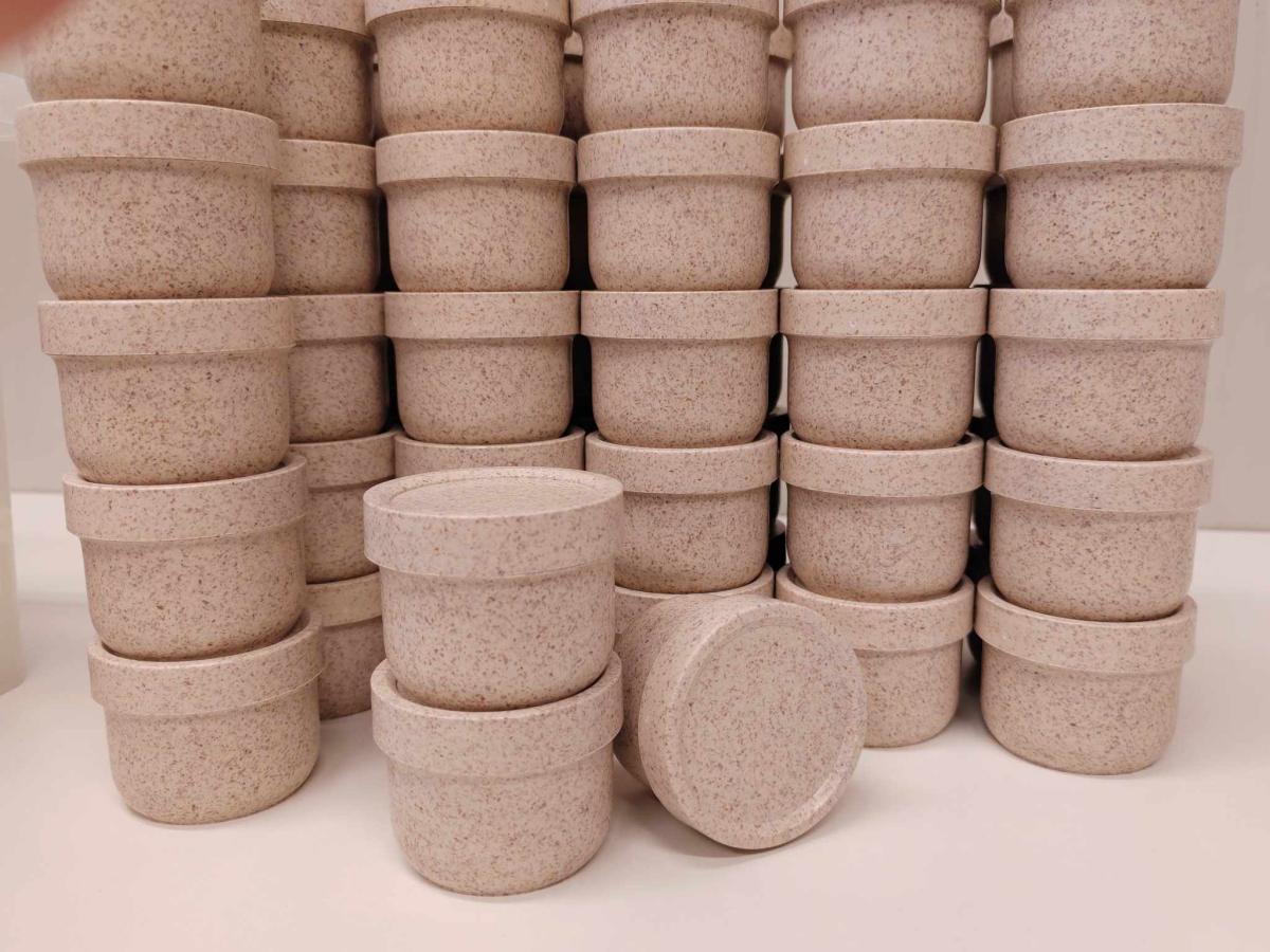 Trajnostna embalaža za vašo naravno kozmetiko. Lonček je izdelan iz materiala z dodatkom rastlinskih vlaken (20% riževih luščin), kar mu daje topel, naraven videz in prijeten občutek na otip. Namenjen je večkratni uporabi in ne vsebuje škodljivih snovi (BPA free).
